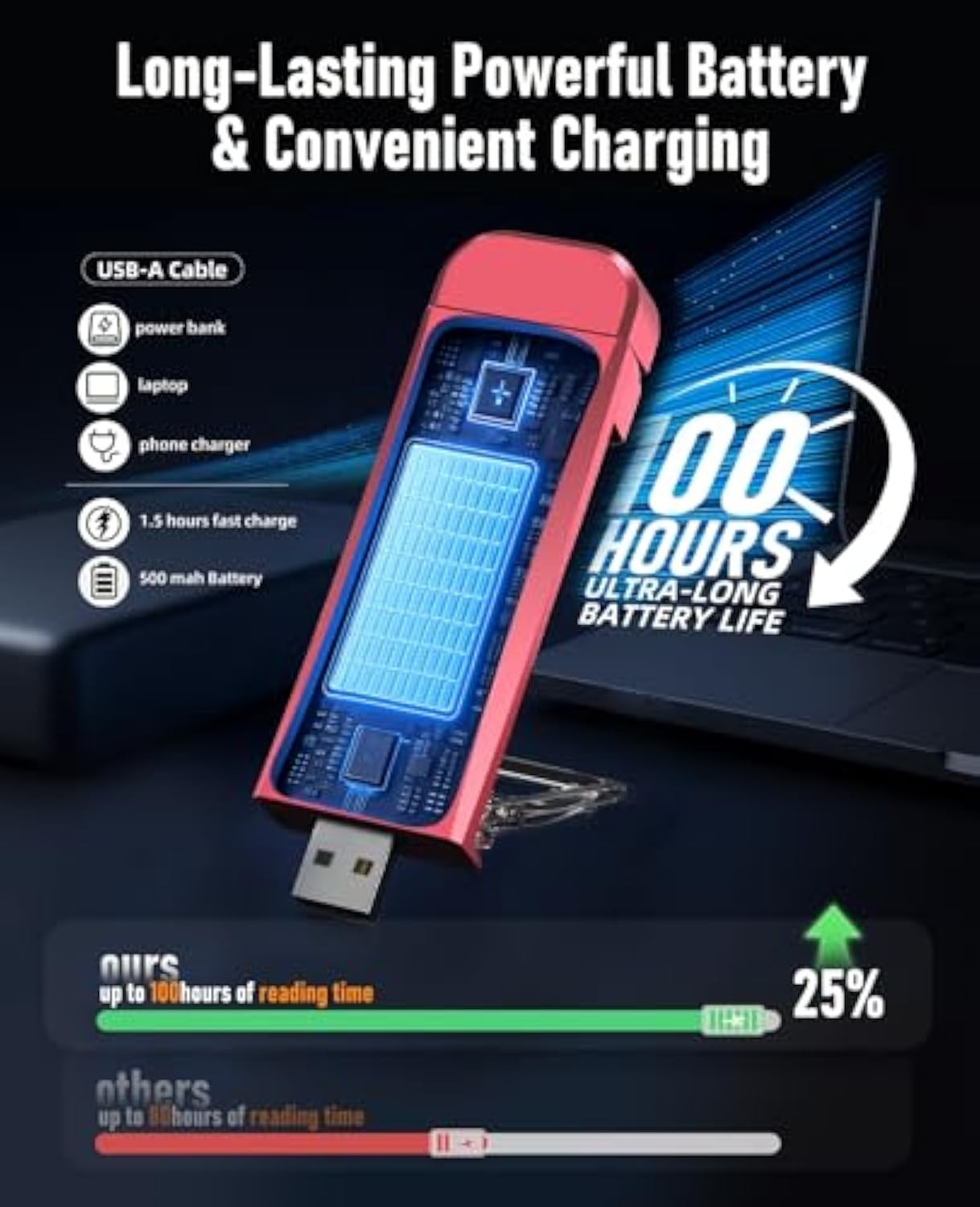[USB Rechargeable &Long Lasting]:The built-in USB charging port design makes charging very convenient,simply plug it into a power bank,laptop,phone adapter,car charger,etc. This reading lights for books in bed has a 500mAh battery,providing 8-100 hours of reading time (depending on your settings).