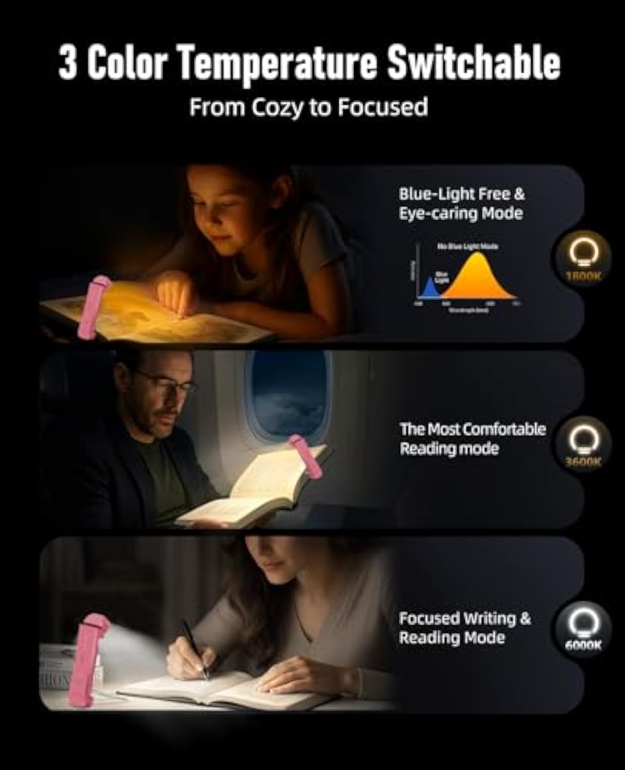 [3 Color & 7 LEDs Precise Dimming & Memory Mode]:This reading light for bed offers 3 color temperatures-Amber(1800K)/Natural(3600K)/Cool White(6000K)for different scenarios.Our book lights are equipped with the latest smart chip and 7 LED Beads,allowing precise dimming brightness from 10-100%.This enables you to set the most comfortable lighting in any environment.With exclusive memory function,you can save your preferred Brightness settings,bidding farewell to repetitive adjustments each time.