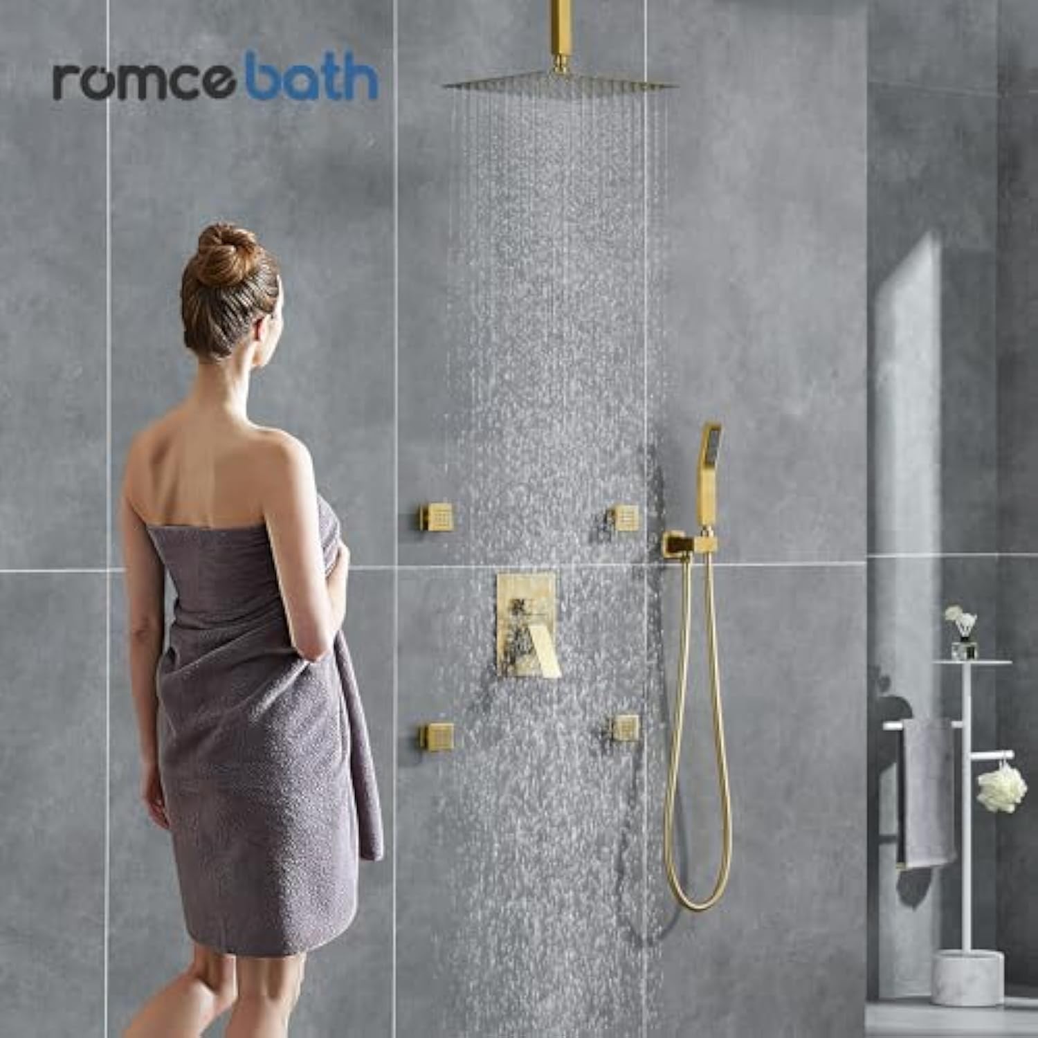 Rain Shower System With Complete 4 Pcs Body Sprays Jets And Pressured Balance Rough-in Valve,12Inch Rainfall Shower Head And Handheld, Modern Brushed Gold Ceiling Mount Shower Faucet Sets