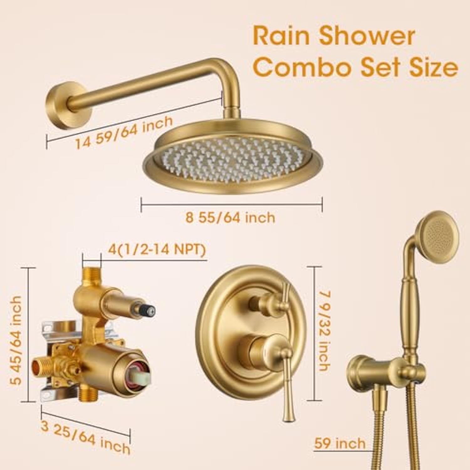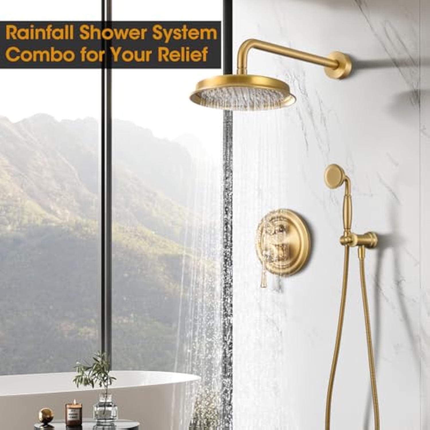 Rainfall Shower Head with Handheld Combo, Brushed Gold Shower System with Balance Pressure Valve, 9 inch Shower Head and Faucet Set, Rain Shower Head with Handheld Spray Wall Mount(B2312-BG)
