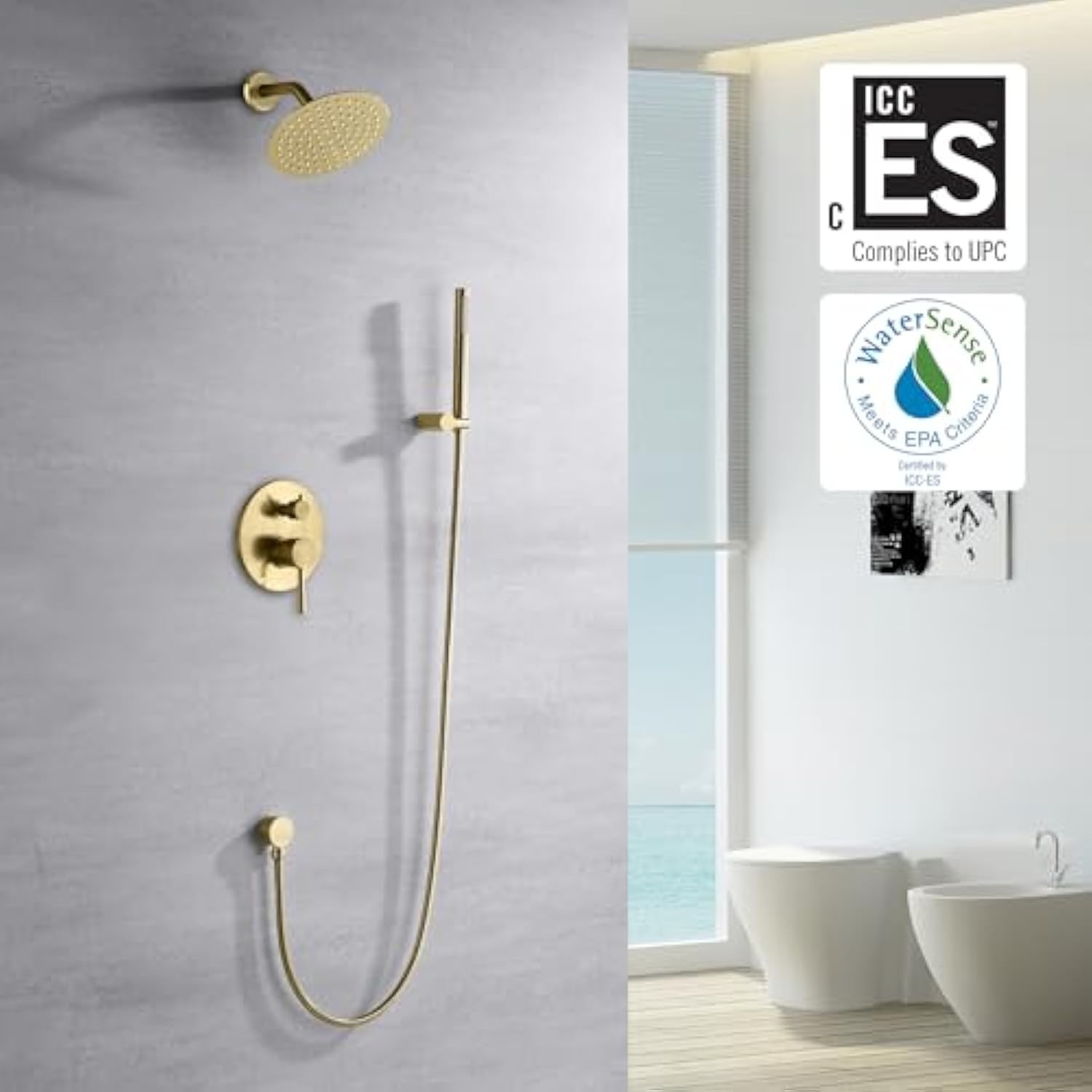 sumerain Brushed Gold Shower Faucet System with high pressure 8 Inches rain shower head and brass hand shower, Rough-In Valve Body and Trim Included